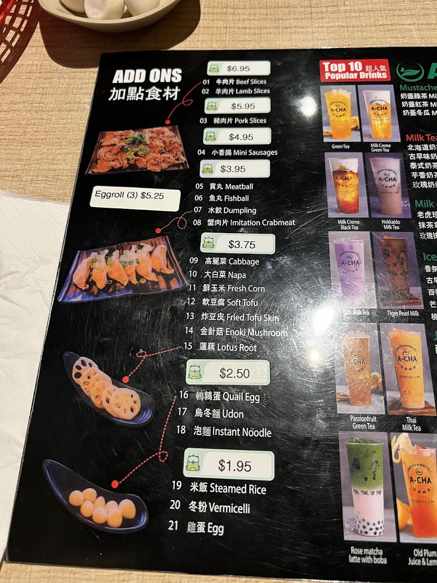 Alongside the hot pots, the menu includes simple accompaniments like extra noodles and udon, helping to balance the meal with both heartiness and texture. The drink options provide a calm complement, featuring carefully prepared teas such as Milk Creme Black Tea and classic varieties like Hokkaido Milk Tea and Passion Fruit Green Tea. For a refreshing contrast, juicy choices like Winter Melon Juice with Lemon offer a lighter note to the experience.